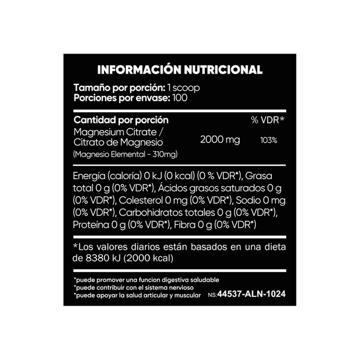 Citrato de Magnesio puro en polvo, altamente biodisponible, esencial para la salud muscular y nerviosa, mejora la función digestiva y fortalece huesos y articulaciones. Origen Natural, Sin aditivos, Sin conservantes, Sin colorantes, Sin aromas artificiales, Sin edulcorantes, No-GMO, Sin alérgenos, Sin soja, Sin gluten, Sin lactosa y con ingredientes puros.