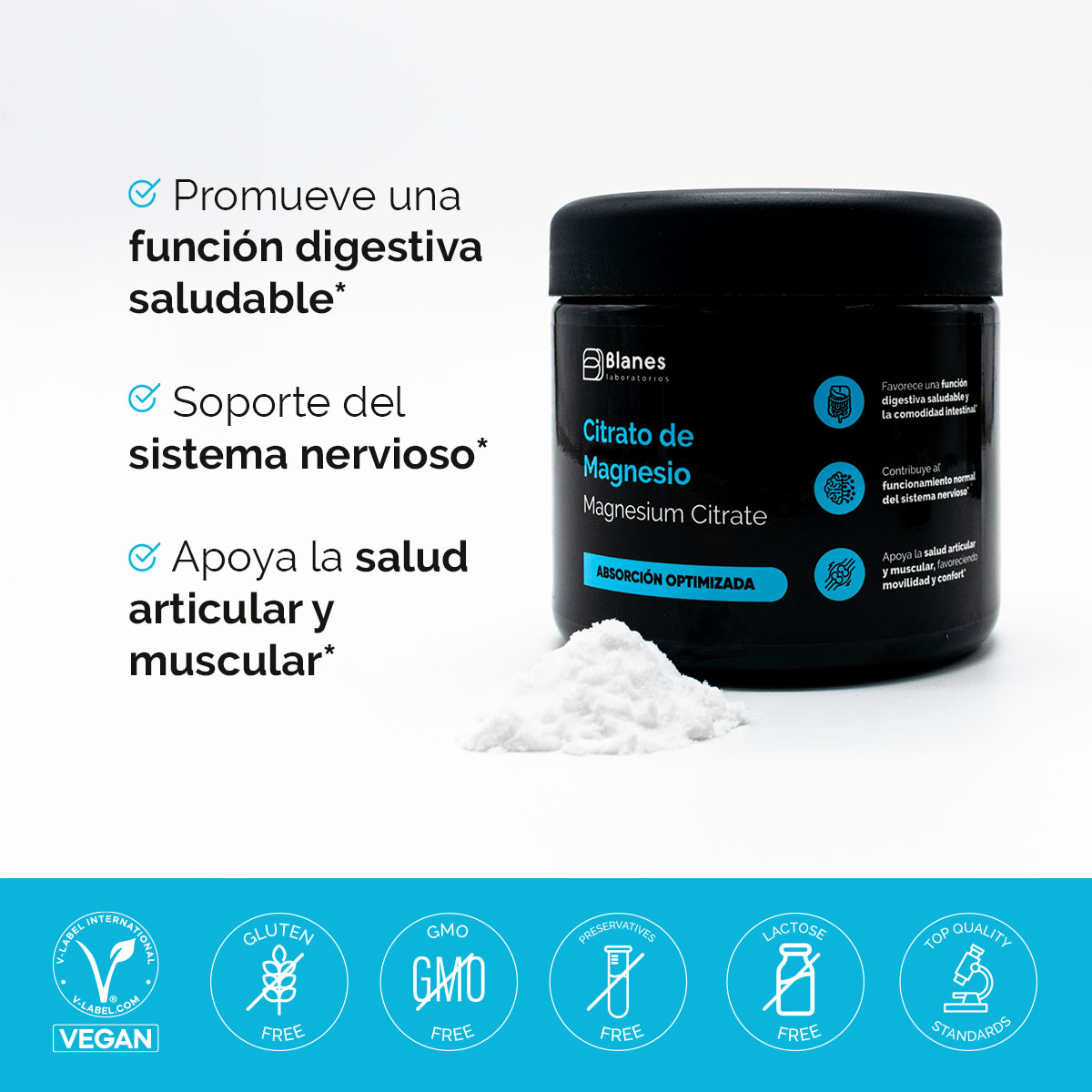 El Citrato de Magnesio en Polvo de Blanes ofrece una fórmula pura y sin aditivos que maximiza sus beneficios. Alivia calambres musculares, mejora la función digestiva y promueve la relajación del sistema nervioso, ayudando a reducir el estrés y mejorar el sueño. Además, fortalece huesos y articulaciones, contribuyendo a una mayor movilidad y bienestar general.