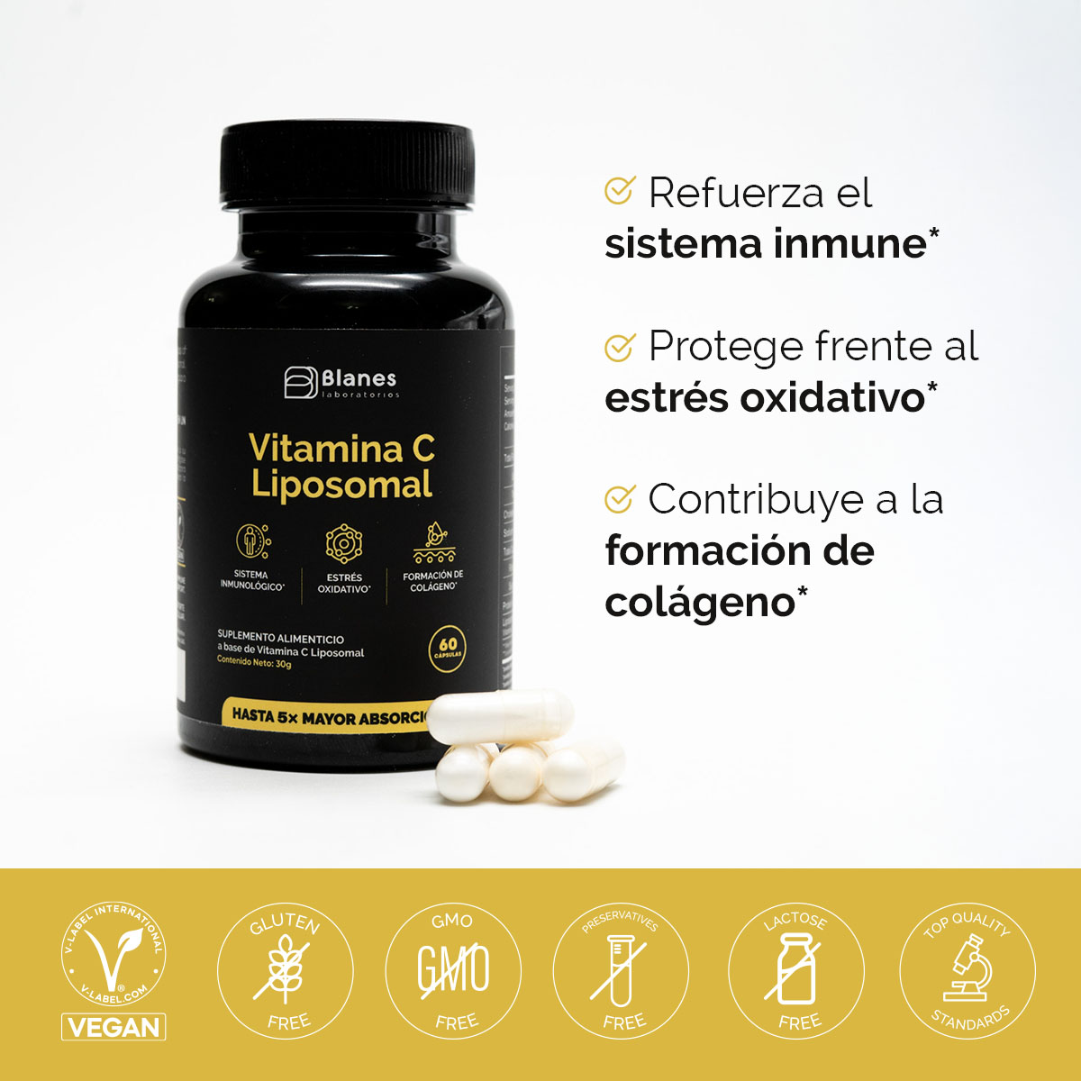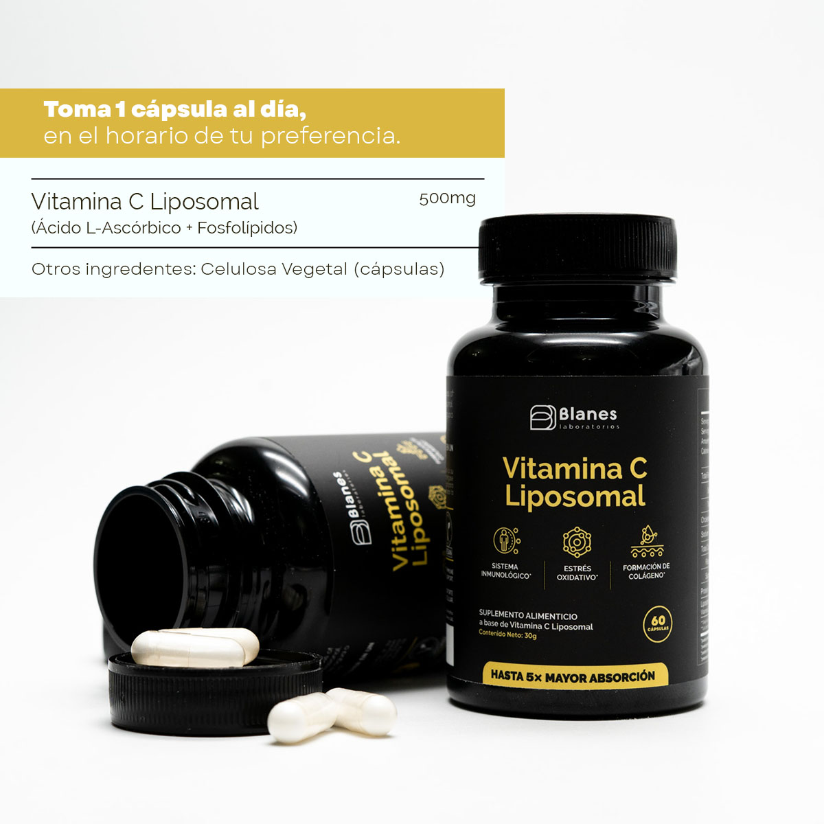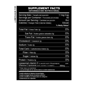 500 mg de Vitamina C Liposomal por cápsula, formulada con tecnología liposomal de alta biodisponibilidad, con estudios que reportan hasta 400% mayor absorción. Diseñada para un mejor aprovechamiento por el organismo frente a la vitamina C convencional, siendo la única vitamina C con tecnología liposomal disponible en Ecuador. Estudios reportan una biodisponibilidad hasta 5 veces mayor, lo que contribuye al funcionamiento normal del sistema inmunológico, ayuda a la protección frente al estrés oxidativo y apoya la formación de colágeno, esencial para la salud de la piel, huesos y articulaciones. Su presentación liposomal permite una mayor efectividad sin generar acidez, siendo suave para el sistema digestivo. Cápsulas vegetales. Sin aditivos, sin conservantes, sin colorantes, sin azúcar, sin gluten y sin lactosa.